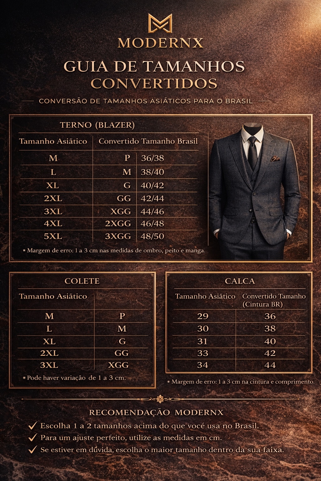 O Conjunto Executive Royal MODERNX é a perfeita harmonia entre tradição sartorial e sofisticação contemporânea. Desenvolvido com padronagem xadrez refinada em tom azul profundo, o traje expressa autoridade silenciosa e confiança natural.